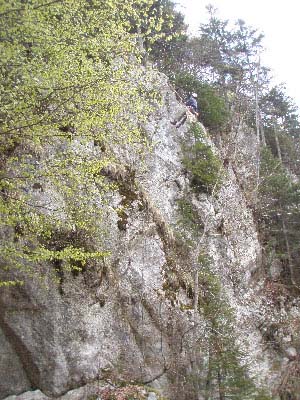 Aujourd’hui, une dizaine de membres du club sont présents.Une première équipe (Vivien, Anne-Cécile, Pierre, Evelyne et Mario) continue la prospection de la zone et comme il y a des falaises c’est l’occasion de faire aussi de l’initiation aux techniques verticales.Prospection en falaise