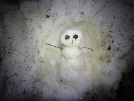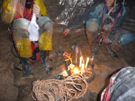 Nous faisons une bonne pause dans la tente ici, avec un point chaud, puis décidons de ne pas continuer, car on est pas loin du but, mais un peu épuisés quand même.La remontée est faite en binômes, Pierre-Do et moi, et Laure et Valentin, mais on se suit de près.Ah quel bonheur de sortir d’un bivouac bien chaud (enfin presque), et de se lancer dans un puits arrosé. C’est clair que ça motive à ne pas y rester, mais c’est pas si long. (par contre ces puits inclinés, ça va mieux à la descente).On remonte donc, puis à un moment, un doute, c’est où qu’on passe ?Pierre-Do essaie par le bas, et moi par le haut, on arrive au même endroit, ouf.À la sortie du trou de verre, une question se pose, la tête ou les pieds devants ?À 3 contre 1, c’est les pieds qui ont gagné, mais les deux solutions étaient tout à fait possibles.Bon on continue, puis faisons encore une petite pause dans la Salle du Tombeau de la Marmotte, et continuons, et nous revoilà vers la neige, au bas du « toboggan ».Je reste en bas pendant que Pierre-Do monte le dernier puits (et je profite de faire un bonhomme de neige souterrain), puis vient le temps de la remontée.