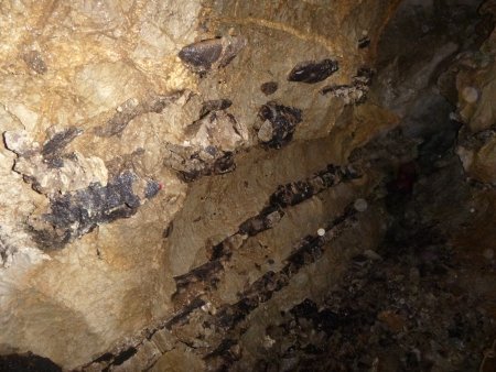 Un par un, pour une raison évidente de pierres instables, nous descendons la trémie, puis à la vire, Felix et Luca descendent les puits, alors que nous continuons la vire et passons le trou de verre.Nous continuons sans bien que mal et un peu en cherchant notre chemin aussi par moments.J’y rencontre aussi une curiosité dont je n’avais jamais vue, des déviations de corde avec de simples mousquetons. Mais, bien encadrés, on passe sans soucis.Il y a de magnifiques strates sombres (lit de cherts (silex)), mais pas solides, ce qui a valu une belle frayeur à Pierre-Do.