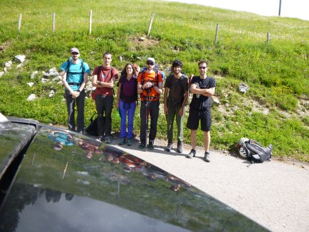Luca, Laure, Pierre-Do, Felix, Philippe C., Valentin B.Sortie au Folliu-Borna proposée par Luca et Laure, afin d’initier et connaître les nouveaux membres.Le programme était assez ambitieux, et d’ailleurs n’a pas été tenu.Rendez-vous devant l’Auberge de l’Ange à Albeuve, puis nous montons au parking avec les deux voitures, interrompus par un bouchon (oui, oui) sur la montée. En effet, une montgolfière s’est posée là, et la nacelle est en cours de chargement sur la remorque.Les aérostiers nous laissent passer avant de charger le ballon.Arrivés au parking, nous répartissons le matériel, puis montons vers l’entrée du Gouffre de la Sainte Barbe.La montée au milieu des narcisses encore bien en fleurs ici, certains même pas encore ouverts, est faite en 40 minutes, puis nous nous équipons.Le but est d’avoir deux équipes, une (Laure, Pierre-Do, Valentin et moi) qui ira en direction de la Salle du Vendredi, afin de faire le topo, et une autre équipe (Luca et Félix) qui vont en direction de l’actif à -370 pour le rééquiper. (j’ai dit programme ambitieux ?)