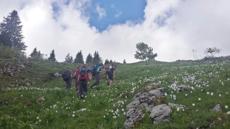 La montée au milieu des narcisses encore bien en fleurs ici, certains même pas encore ouverts, est faite en 40 minutes, puis nous nous équipons.