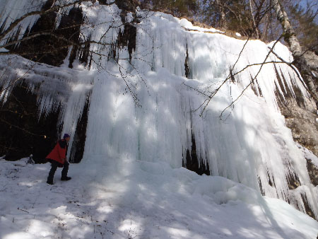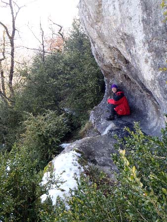 Ensuite déplacement au fond des gorges de l’Orbe pour réviser deux autres cavités. Quelques pieds de falaises, les moins exposées aux chutes de glace, sont prospectées.Au fond des gorges c’est encore bien gelé