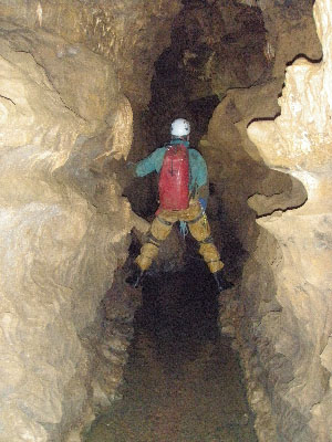Après quoi on débouche alors dans la rivière qui s’écoule dans une galerie rectiligne axée sur une haute fracture.