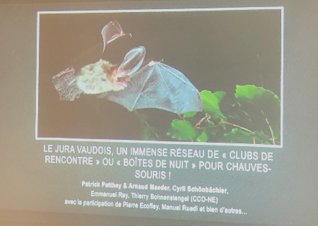 Nous avons notamment appris comment il a été possible de mettre en évidence des activités de swarming (rassemblement automnal) dans plusieurs gouffres du Jura vaudois.En outre, nous avons été informé sur l’alerte au WNS (ou syndrome du nez blanc) qui peut décimer des colonies entières.Le thème de la protection des sites a été aussi abordé (comportement, périodes de visites, etc.) et dans le futur, il se pourrait que des mesures de protection soient mises en place pour les grottes et les mines de grande importance pour les chauves-souris.Merci à Eric qui a lancé l’organisation de cette soirée et bien sûr un grand merci aux deux personnes du CCO.