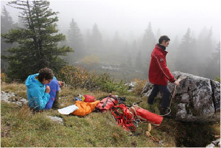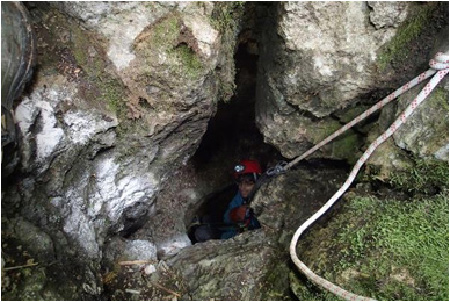 Nicoleta et Félix sont descendus une fois que Pierre Do et Eric ont équipé la tête de puits. Quelques rayons de soleil ont fait que les 3 membres de l’équipe restés à la surface n’ont pas eu trop froid pendant qu’ils attendaient. Comme il y avait juste un seul spit en tête de puits, Nicoleta a essayé d’en rajouter un deuxième, mais la perceuse a rendu l’âme après un trou et demi. Comme l’amarrage naturel en haut du puits était bien solide (le gros caillou à l’entrée du gouffre), nous décidons de descendre sur le seul spit.