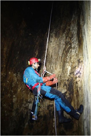 La tête de puits a été équipée grâce à l’amarrage naturel et au spit en place. Lors du déséquipement, nous n’avons plus pu dévisser la vis du spit et, lors des efforts pour la dévisser nous avons abimé l’amarrage qui était déjà vieux. Pour des raisons de sécurité, nous avons décidé d’enlever complétement cet amarrage. Donc actuellement il n’y a plus aucun amarrage en tête de puits.