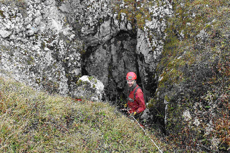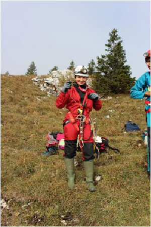 Nous sommes ensuite allés à la Baume du Chalet de Yens.Sur le versant nord du Mont Tendre le vent soufflait fort et, pendant que Félix et Pierre Do ont équipé le puits de 40 m et sont descendus, le reste de l’équipe a eu vraiment froid. Nous avons fait des tours de l’entrée du gouffre en jogging pour nous réchauffer, sans un trop grand succès.