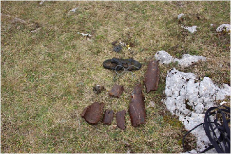 Les déchets sortis ont été une chaussure, des fils métalliques et surtout de lourds déchets métalliques qui, une fois à la surface se sont avérés des restes d’obus. De commun accord, nous avons décidé de laisser les restes d’obus sur place, à côté de la clôture du gouffre et d’appeler le 117 pour que des professionnels s’en occupent.