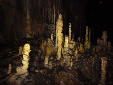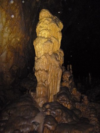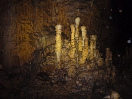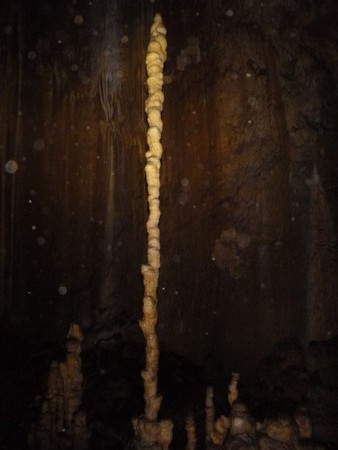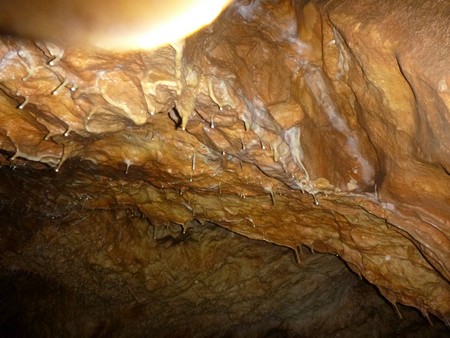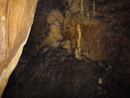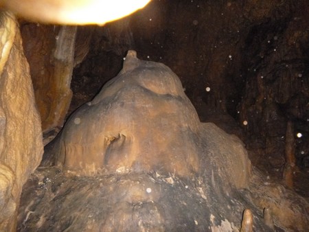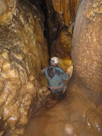 Nous allons vers le fond du gouffre, tout en admirant les concrétions, puis il y a un passage où marcher ne suffit plus, une petite montée et nous sommes dans la salle terminale.Nous voyons qu’une désobstruction a été tentée, mais cela semble encore étroit, nous en resterons donc là. Evidemment, en geocacheurs que nous sommes, nous n’oublierons pas de trouver la boîte et signer le carnet à l’intérieur.