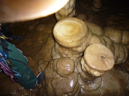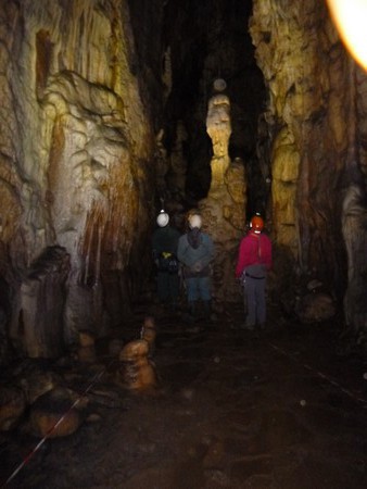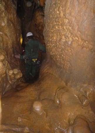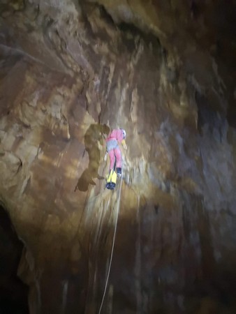 Philippe C. descente du P18 (photo d’Alain)Quels volumes, de magnifiques concrétions et coulées, on ne sait plus où regarder.Regarder où on met les pieds, par exemple, est peut-être le mieux à faire, car, si le passage est balisé (avec des rubalise du plus mauvais effet, pour une raison évidente de préservation), le passage de nombreux spéléologues rend le sol lisse et glissant.