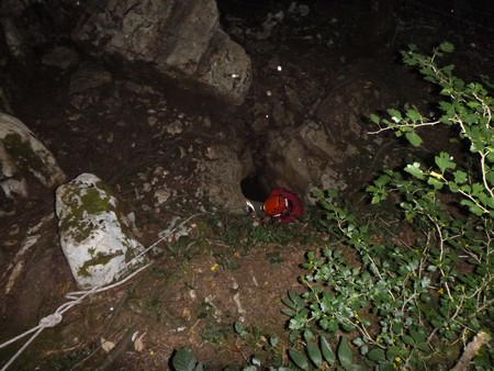 Philippe C. (GSL), Philippe V. (sympathisant GSAM et Catamaran), Alain et Guillaume.La décision de faire cette sortie s'est préparée il y a environ une semaine.Selon ce que j'ai vu sur la fiche de ce gouffre sur le site, ce gouffre avait déjà été visité en 2010 par 4 membres du GSL (qui ont eu de la peine à trouver l'entrée).Une fois la date qui arrangeait tout le monde trouvée, nous nous sommes données rendez-vous point parking aux alentours de 19h30-20h. Tout le monde a de l'avance, donc nous nous équipons et allons vers l'entrée, qui, cette fois, fut facilement trouvée.Nous avons une corde de 60 mètres qui suffira pour toute la descente.C'est Alain, sous la supervision de Philippe V. (sympathisant GSAM, Groupe Spéléologique Archéologique Mandeure, et Groupe Spéléo Catamaran) qui équipe, et entre dans le puits à 19h45, puis le premier puits passé, c'est Guillaume qui se remémore les différentes manipulation avec mon aide, et qui descend.Je suis le dernier à descendre, et je dois dire que le P18, commençant dans une faille étroite sur 3 mètres, puis débouche "plein vide", est impressionnant.Comme toute cette grotte d'ailleurs.Philippe C. descente du P18 (photo d'Alain)