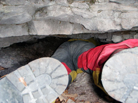 Grâce au matériel à Michel, le resserrement n’est bientôt plus qu’un souvenir mais derrière la suite n’est vraiment pas engageante car le trou se poursuit par un mini boyau visible sur plusieurs mètres …
