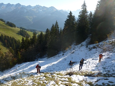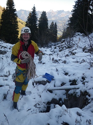 Après examen de la motivation des troupes, nous optons finalement pour une traversée Gouffre des Couennes – Gouffre de la Voie Lactée.Les participants font tout de même une tête étrange lorsqu’ils voient Laure expliquer à Carsten comment enfiler le baudrier et utiliser le descendeur… c’est en effet sa première sortie sous terre !Nous nous dirigeons donc vers l’entrée du Gouffre des Couennes.