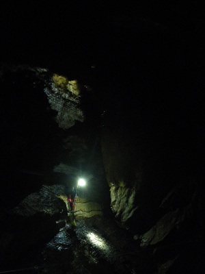 Carsten à la fin du Méandre de la Salamandre.Un peu plus loin, de grands et vastes puits se succèdent et nous arrivons dans le puits des superlatifs :