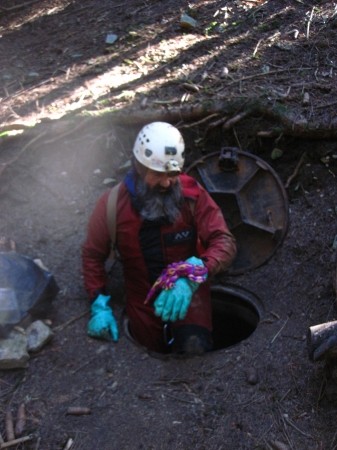 L’entrée du trou est protégée par une lourde trappe qui ressemble à une bouche d’égout (cf photo ci-dessus : Jean Luc à la sortie) qui est cadenassée (il faut contacter Jean-Luc si on veut la visiter). A noter qu’il est conseillé de laisser la trappe ouverte pendant qu’on est à l’intérieur, car il est difficile de l’ouvrir depuis l’intérieur debout sur l’échelle.On descends ensuite plusieurs échelles pour rejoindre une galerie semi-fossile (ie qui ne coule qu’en crue, mais avec plusieurs trous d’eau, certains montant un peu au dessus du bassin alors que le niveau d’eau est anormalement bas).