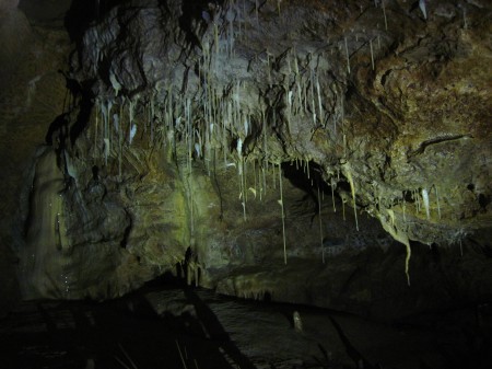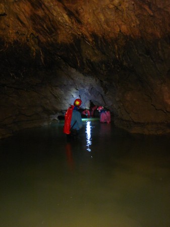 Premier rendez-vous à 6h40 chez Anna à Lausanne. De là on part pour Sainte-Marie, dans le Doubs, où on a rendez-vous à 9h30. On rencontre Jean-Luc (d’un club local, qui nous a guidé dans la grotte) ainsi que Hansruedi (qui a organisé cette sortie interclubs) et son ami Daniel.En fait ensuite une dizaine de minutes en voiture pour arriver à la grotte (qui est à 2 minutes à pied du parking). On commence par s’équiper : pour une fois, pas besoin de baudrier, en revanche il faut la combinaison néoprène (chaussettes et gants néoprènes conseillés, certains ont échangé leurs bottes contre des chaussures de canyon, mais ça se fait bien aussi en bottes). Il est vivement conseillé de mettre la combi spéléo au dessus de la néoprène, certains passages étant assez abrasif.Jean-Luc nous explique ensuite l’origine du nom « Trou du Pic » : le réseau complet fait 7 km à vol d’oiseau de la perte à la résurgence, avec de nombreux siphons. Pour réussir à continuer les explorations, et ayant trouvé un réseau de belle taille (1.5km de belles galeries), ils ont décidé de forer une entrée artificielle juste avant le 4ième siphon depuis l’aval. Jean-Luc, qui en plus d’être prof de maths et de physique est également sourcier, a demandé aux plongeurs de placer une tête de pioche (en métal) en haut d’une des galeries qui semblaient être proche de la surface (2m d’après la topo). Horizontalement, il a très bien réussi à la localiser (moins de 2m de décalage), en revanche il y avait une erreur sur le placement de la résurgence sur la carte IGN, du coup ils n’ont pas du creuser 2m mais 12 !