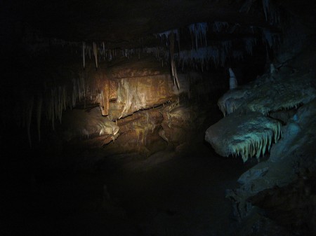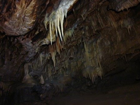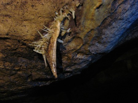 A noter que certaines des plus belles concrétions sont bien cachées dans des fissures : ça vaut vraiment le coup d’avoir un guide, et Jean-Luc en était un excellent!On arrive ensuite au collecteur, une rivière très tranquille quand le niveau d’eau est aussi bas qu’il l’a été lors de notre visite (mais qui peut devenir violente en cas de crue, noyant la galerie presque partout).Laure avait acheté un crocodile gonflable en guise d’embarcation …