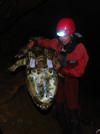 … qui a crevé avant même d’avoir été mis à l’eau. Du coup, On a utilisé 4 kayaks (qui reste à demeure dans la grotte) et une chambre à air de camion comme embarcation pour les visiteurs, notre guide ayant pour habitude d’y aller à la nage (s’aidant par endroit de la corde fixée en main courante tout du long, qui permet de remonter le courant en cas de petite crue).